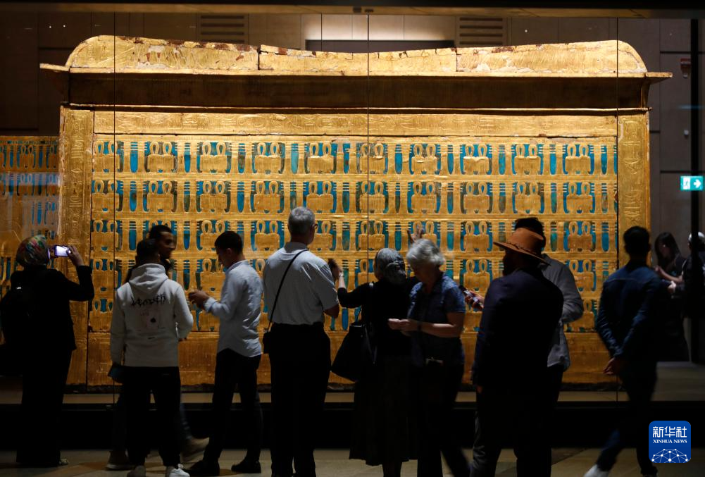 11月4日,在埃及吉萨的大埃及博物馆,游客在法老图坦卡蒙展馆参观神龛。
