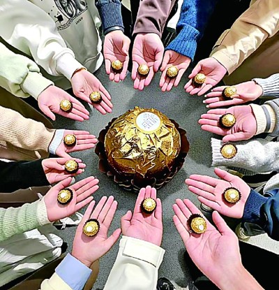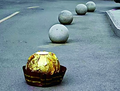作者宁鹏选择“巧克力”这一极具日常感和亲和力的符号,将其置于校园这一特定的公共空间中。巧克力象征甜蜜、分享、愉悦,其形态又具有高辨识度和趣味性。当金纸包装的、圆形的费列罗巧克力,变成一件放大的、与石墩子巧妙结合的装置作品时,瞬间打破了艺术品与日常物的界限。而作者在开幕式上分发真实巧克力的行为,更将作品从静态的“观看对象”转变为可参与、可体验、可分享的“互动事件”。互联网进一步放大了这种互动,让校园内发生的微小仪式,成为众多网友共同围观、解读、传播的公共话题,作品名称也被改造成更富传播趣味的谐音“费力挪”。