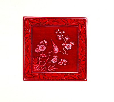 故宫博物院藏明代剔红梅竹寒鹊图方盘,通体髹朱漆,盘心在天锦地上压雕花鸟图案,左下竹石遒劲。婀娜多姿的折枝之上,梅花争奇斗艳,清秀高雅,一只喜鹊引颈逗梅,寓意“喜上眉梢”,呈现出一幅生动的隆冬之景。画面以横线锦文作地表现天空,四边各雕朱漆茶花花叶,间隙中还可以看见黄色的素漆地。