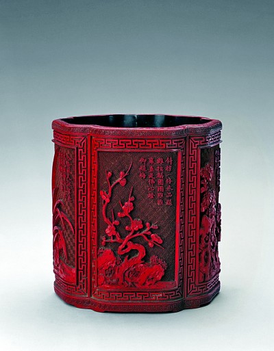 清代剔红开光花卉纹葵瓣式笔筒 作品系故宫博物院藏