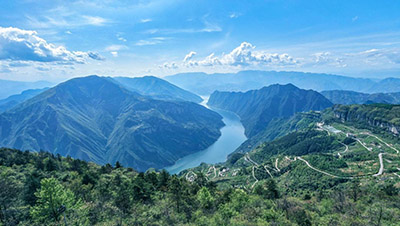重庆市巫山县,长江三峡巫峡段呈现一江碧水,两岸青山,春意盎然,在蓝天白云映衬下构成一幅壮美的生态山水画卷
