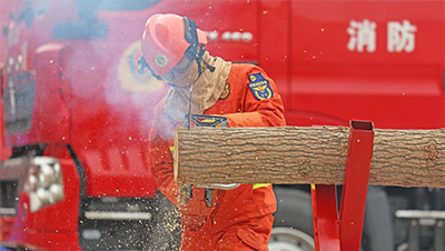山东省临沂市郯城县消防救援大队开展跨越火墙、木材切割等森林消防科目训练,提升消防救援人员应急处置能力,以练为战砺精兵。图为消防救援人员正在进行跨越火墙训练