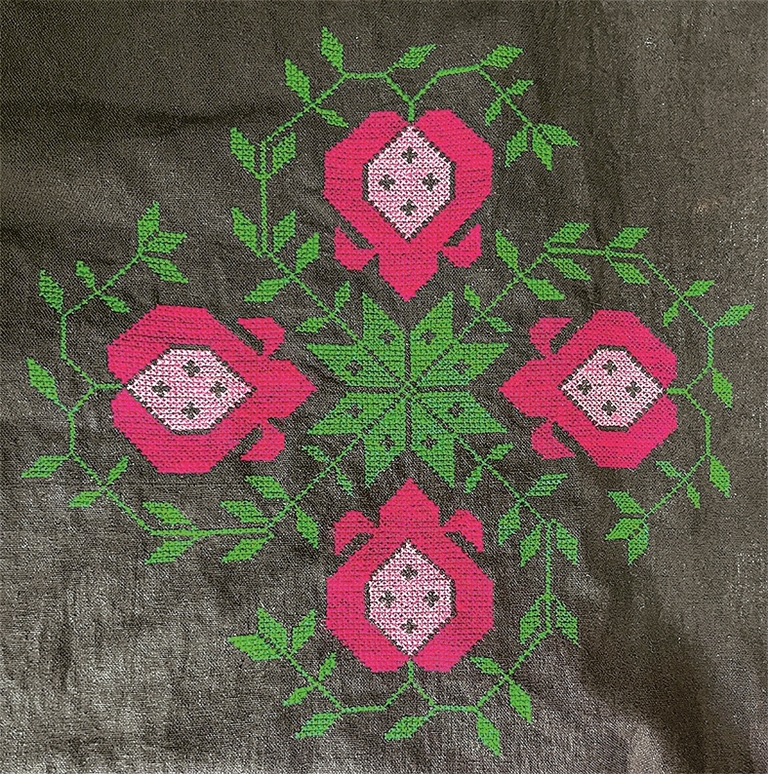 挑花讲究“数纱”。经纬交错的布面像一张格网,针从哪里起、往哪里走,都要依格计数;十字针铺出形体,空针留出气口。它不追求写生式的晕染,而以结构成立:花心怎样立住、瓣片如何分层、枝蔓怎样转折,全靠针脚的疏密与路径。空针形成的“透”,不是空缺,而像春风穿过枝叶的缝隙,让图案不至于堵满,也让“生长”有了呼吸。也正因为“一针一数”的慢功夫,挑花特别适合表达春天:春不是骤然喧闹,而是从一点点萌发开始,循序铺开,终至盛放。