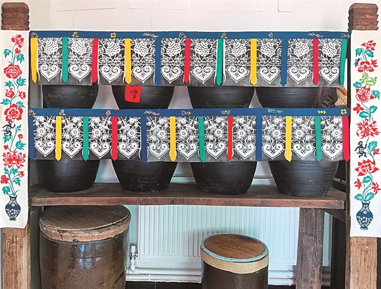 富县熏画的起源与发展,有赖于古鄜州(今富县)深厚的剪纸传统。宋元时期,当地剪纸技艺日趋成熟,技法多样、题材丰富,并融入婚丧嫁娶、岁时节令等民俗生活。明清之际,民间妇女为留存心仪的剪纸花样,摸索出以烟熏复刻纹样的方法,即将剪纸底稿覆于纸面,再借炊烟慢熏,使纹样清晰印于其上。以此种方法制作的熏样很快与当地农家的生活需求相融。富县农家用于存放米缸、餐具的碗架多为三层立式木架,妇女们便将熏样进行裁剪,贴于木架的正面敞口处作为防尘的门帘,让朴素的家具焕然一新。每逢年节还可更换新的熏样,为室内增添节庆氛围。这样的门帘被称作“碗架云子”,是富县熏画的早期雏形,兼具实用价值与审美趣味。