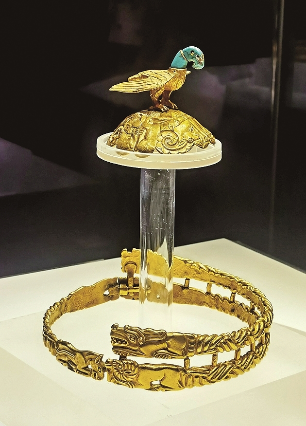 内蒙古鄂尔多斯市阿鲁柴登出土的鹰顶金冠饰(战国)光明日报记者李韵摄/光明图片